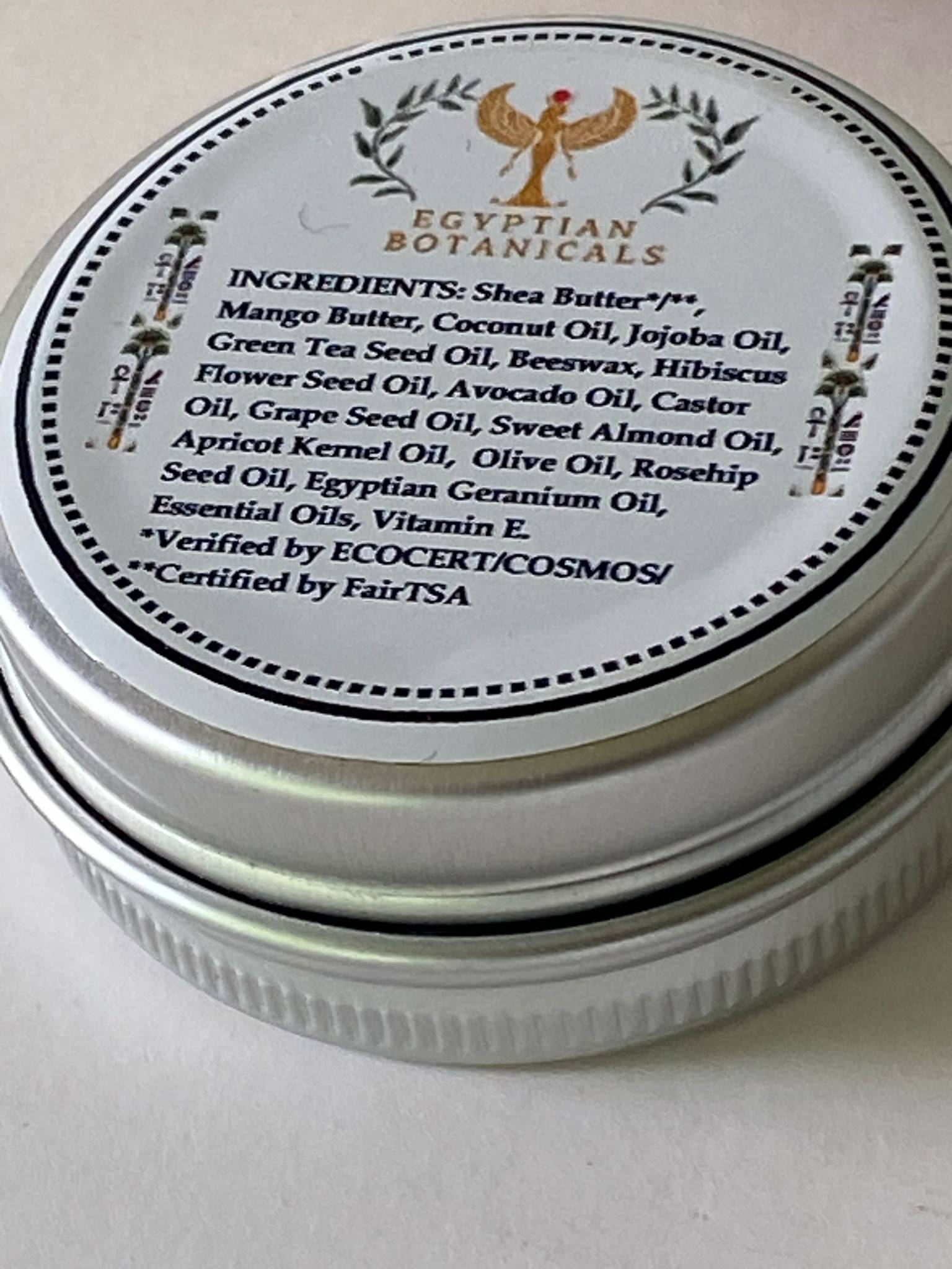 Butyrospermum Parkii (Shea Butter)*/**, Mangifera Indica (Mango Butter), Cocos Nucifera (Coconut) Oil, Simmondsia Chinensi (Jojoba) Oil, Cera Alba (Beeswax), Hibiscus Sabdariffa (Hibiscus Flower Seed) Oil, Persea Gratissima (Avocado) Oil, Ricinus Communis (Castor) Oil, Vitis Vinifera (Grape Seed) Oil, Prunus Amygdalus Dulcis (Sweet Almond) Oil, Prunus Armeniaca (Apricot Kernel) Oil, Olea Europaea (Olive) Oil, Rosa Canina (Rosehip Seed) Oil, Pelargonium x Asperum (Egyptian Geranium) Oil, Lavandula Angustifolia (Lavender) Oil, Matricaria Chamomilla L (Chamomile) Oil, Salvia Sclarea (Clary Sage) Oil,Tocopherol (Vitamin E).