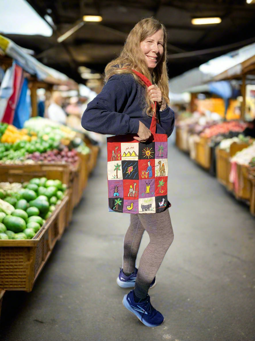 This hand embroidered tote bag, crafted with care by skilled Egyptian women artisans, depicts nostalgic pastoral scenes of farmers, animals, and lush vegetation, using bright thread over crisp Egyptian cotton canvas. The embroideries mirror the cheerful and rich colours of Egyptian country life. The tote bag’s hand-stitched design gives it a charming rural aesthetic—adding a warm, boho flair to any outfit.